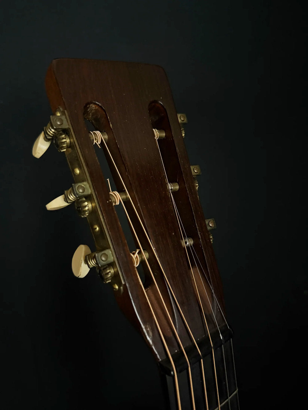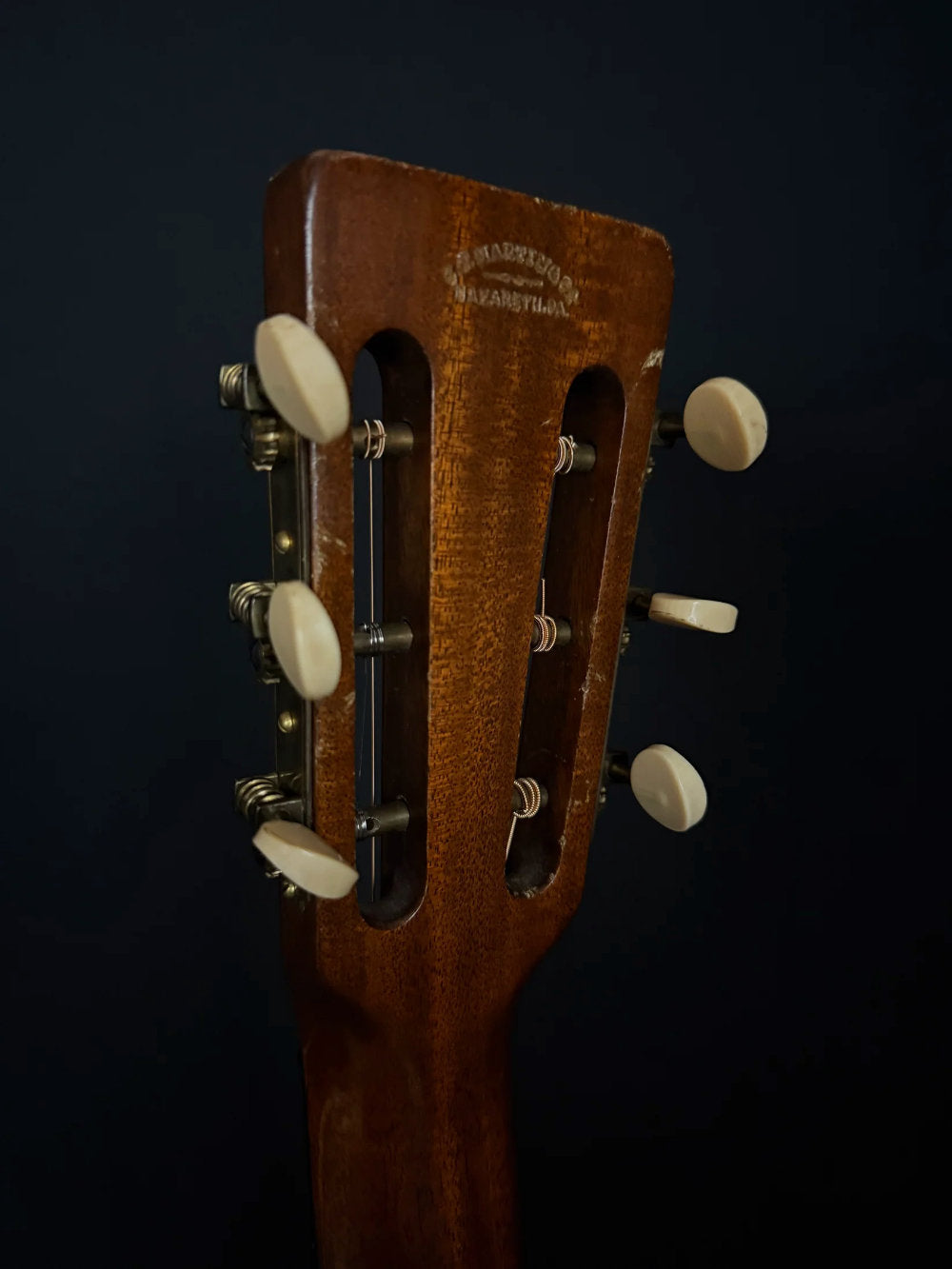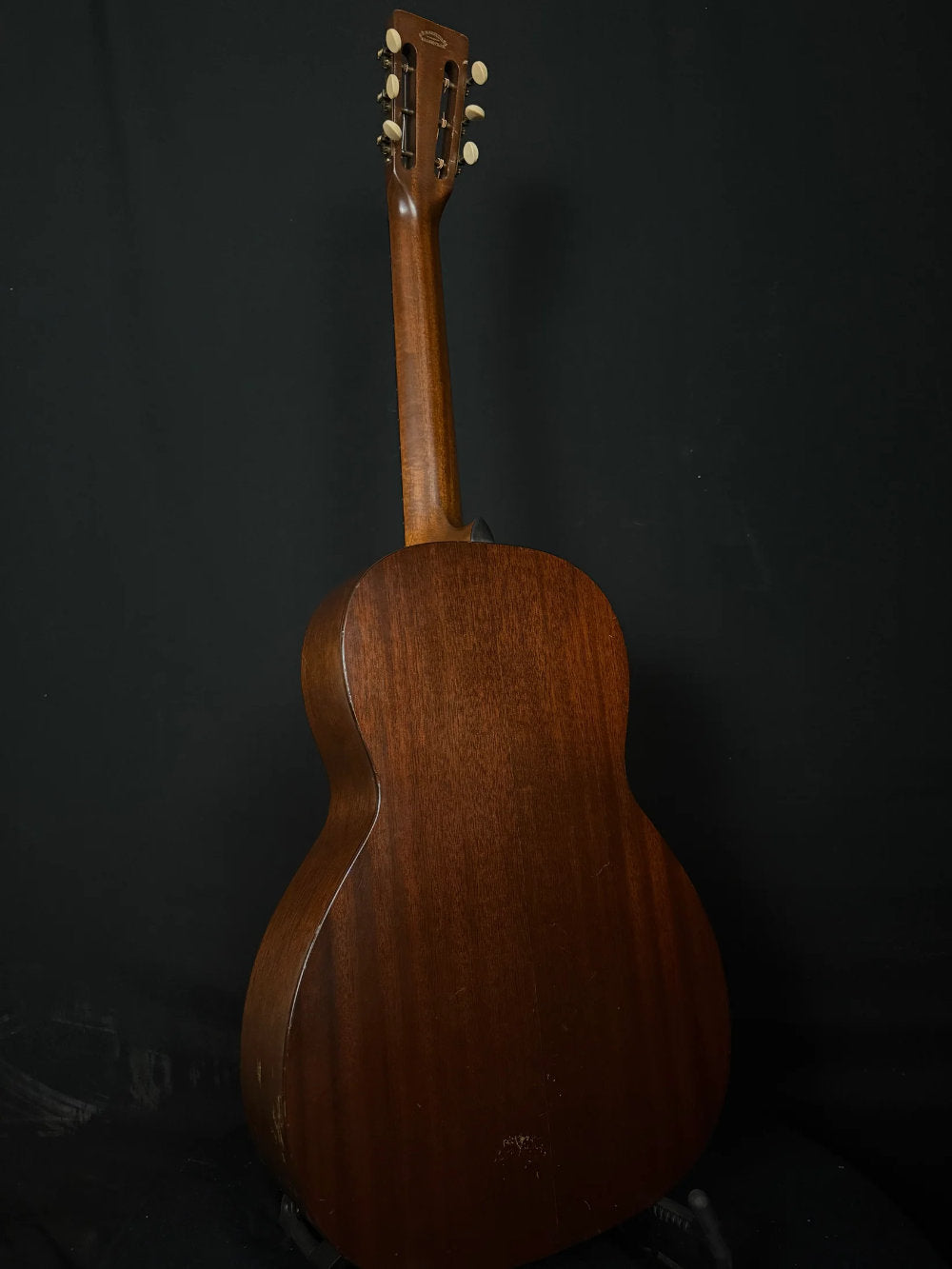 While this guitar is in amazing condition for its age, there are the usual repairs for an instrument of this age. First is the replacement belly style bridge, and upon further interior inspection there is a replaced bridge plate with a date of 1996. The crack in back of the bridge has been properly cleated, as is the one on the upper bout, bass side. Though there is very little evidence showing it was done, I would be surprised if this instrument has NOT had a neck reset and new bar frets. However, all work on this instrument is outstanding. Tuning machines look to be original.