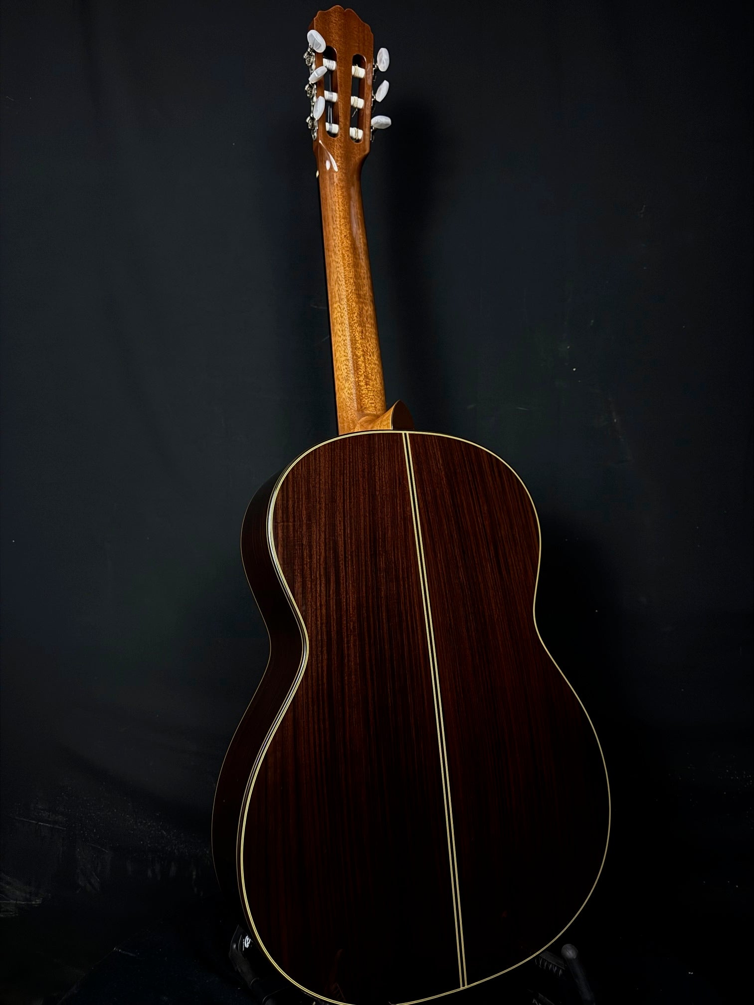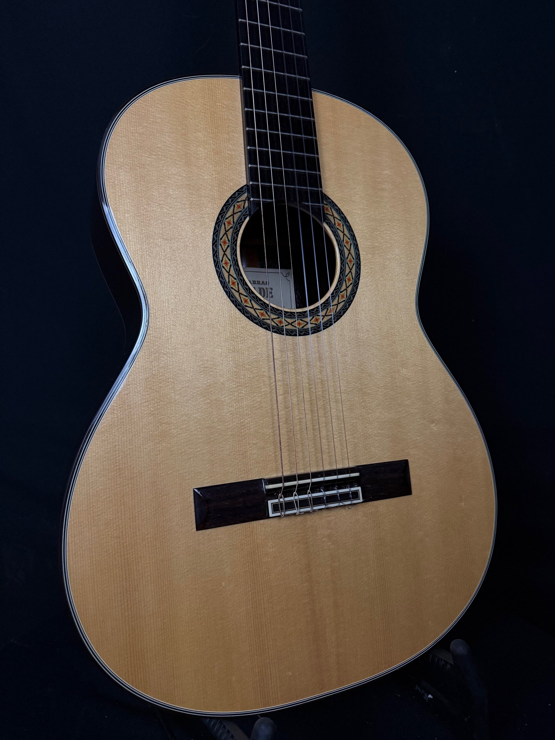 This 2000 Hirade (made by Takamine) is an outstanding instrument for someone looking for a nylon string guitar to add to their arsenal without breaking the bank. This one is in great condition for its age, with only a few minor scuffs. There is bit of noticeable play wear on the top where a pick guard would be on a steel string guitar. Original hard case included.