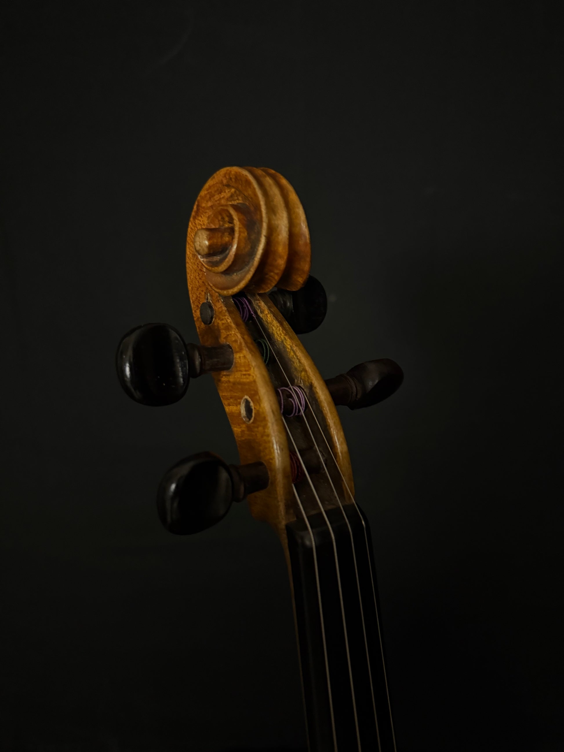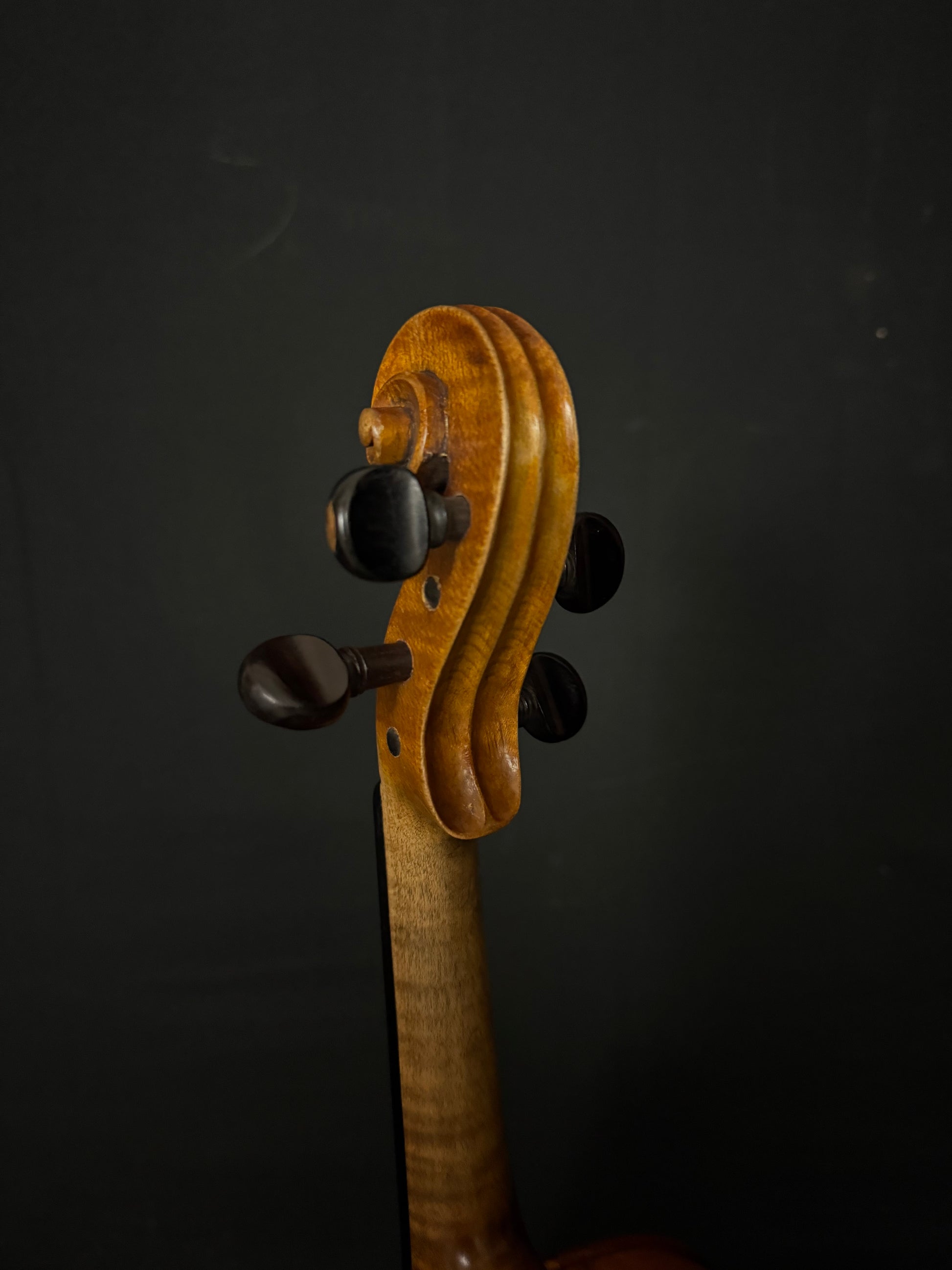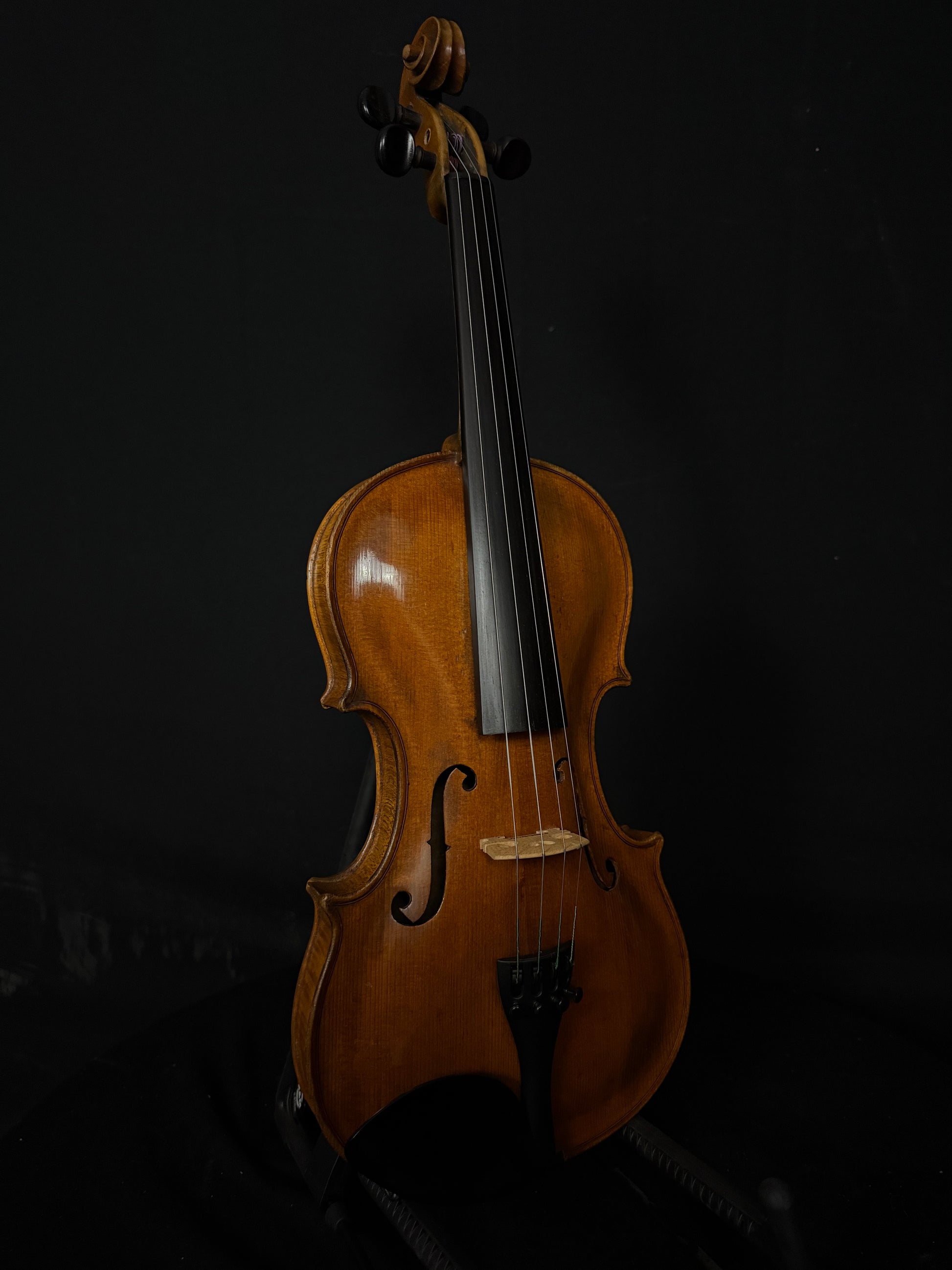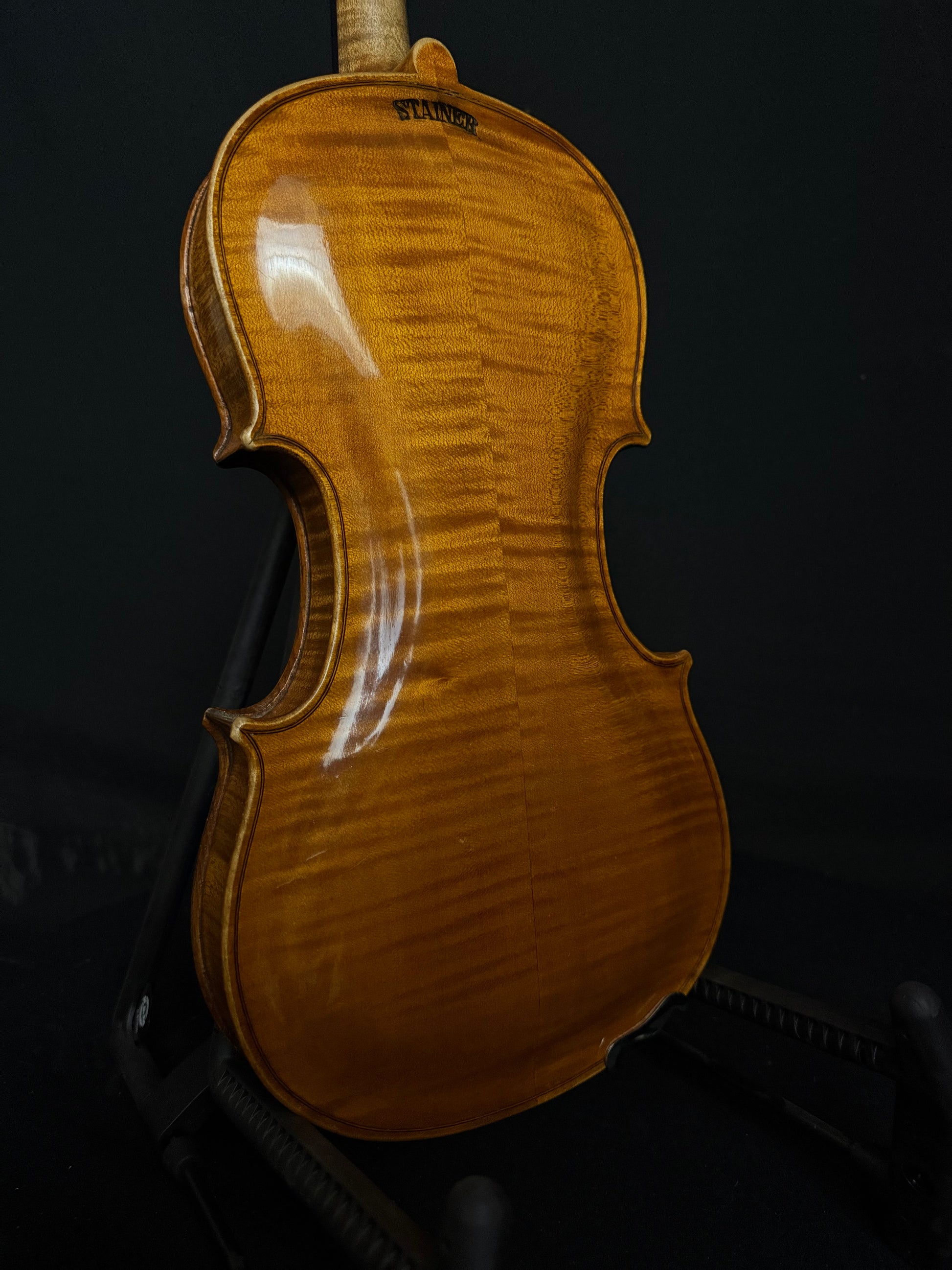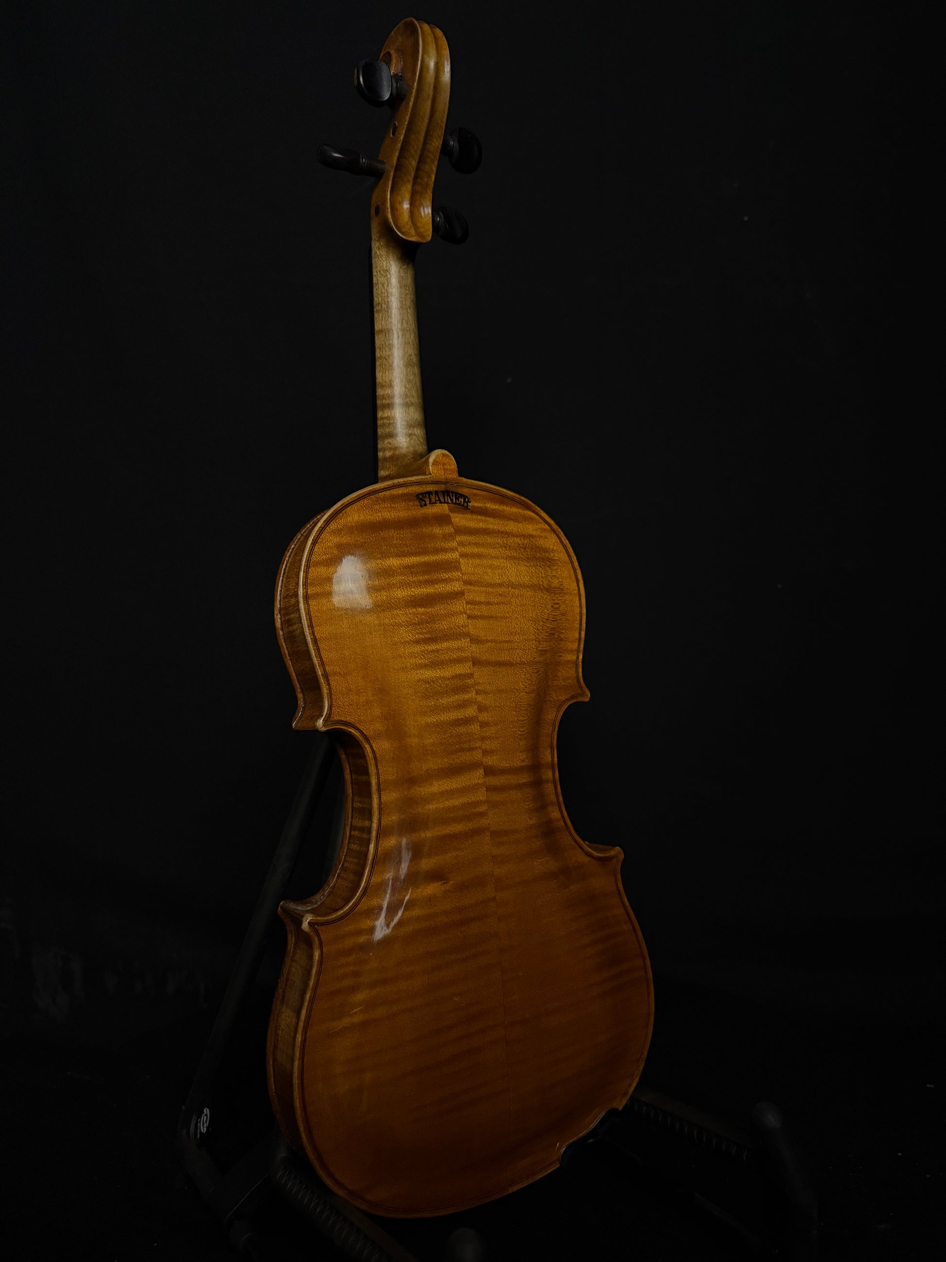 Though there is no label or country of origin, it's quite clear that this is most likely a German workshop made Stainer copy that is at least a hundred years old.