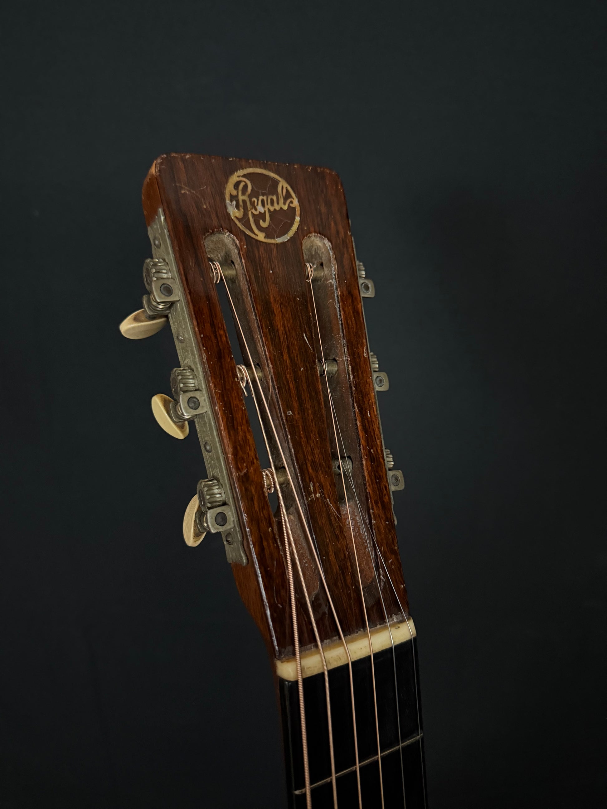 The guitar is the "Concert" sized version of Regal's "Custom Built" models. Spruce top with rosewood back/sides. 12 fret slotted peghead. Mahogany neck has a deep "C" profile and a 24.5" scale. Tuners appear to be original and function well. Replacement ebony bridge/bone saddle. Bone 1-7/8th's nut appears to be original, and it has had a recent neck reset. Paper oval Regal label is in tact and very well preserved. Pearl Regal script on rosewood headstock veneer. Oval metal Regal medallion on back of headstock.