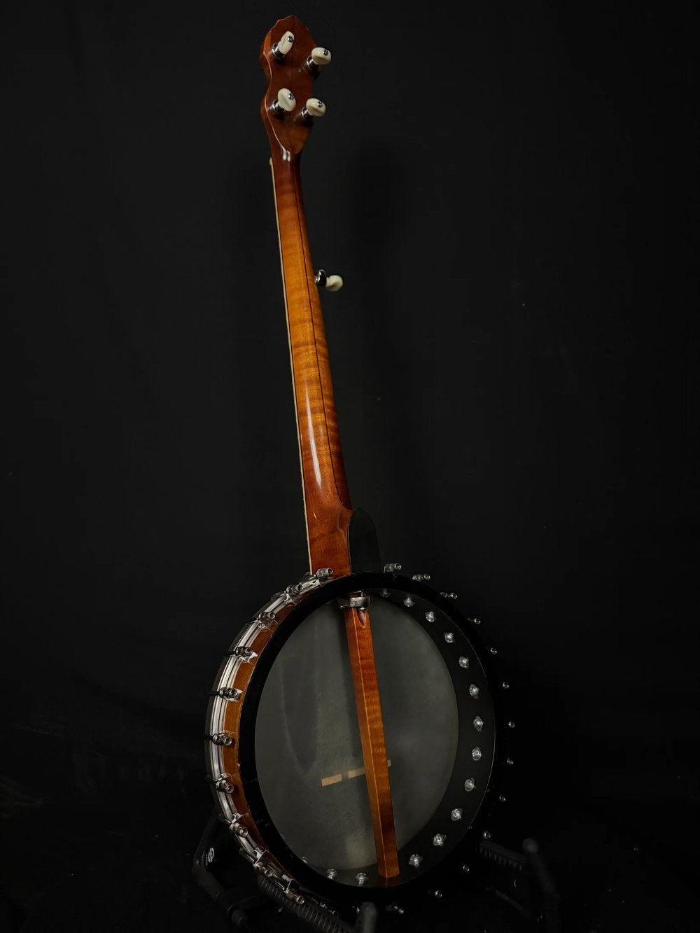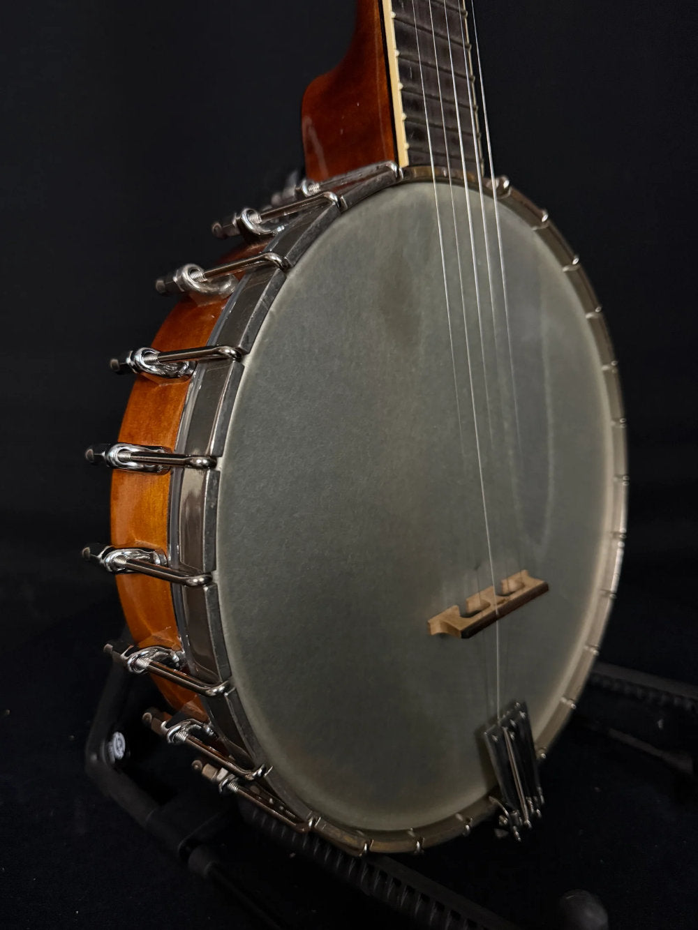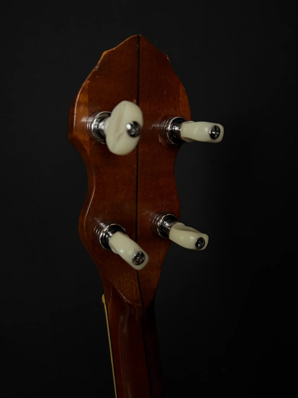 Through this banjo comes to us with no makers mark, this is a great opportunity for someone on a budget to get a great playing and sounding open back banjo! Just the perfect amount of "cluck" with its rolled brass tone ring and even more added value with its Gold Gate "Superior" case. Killer deal!