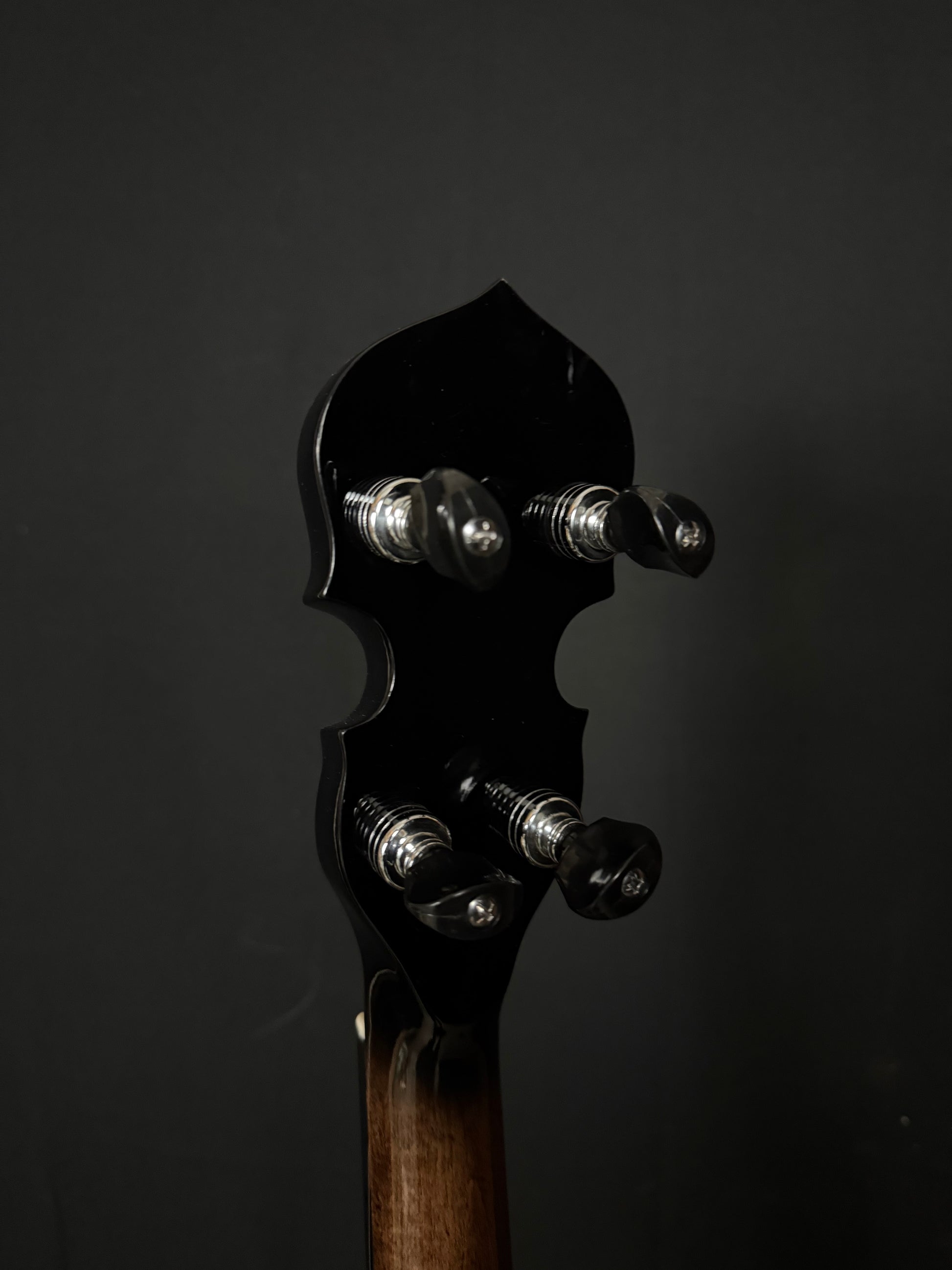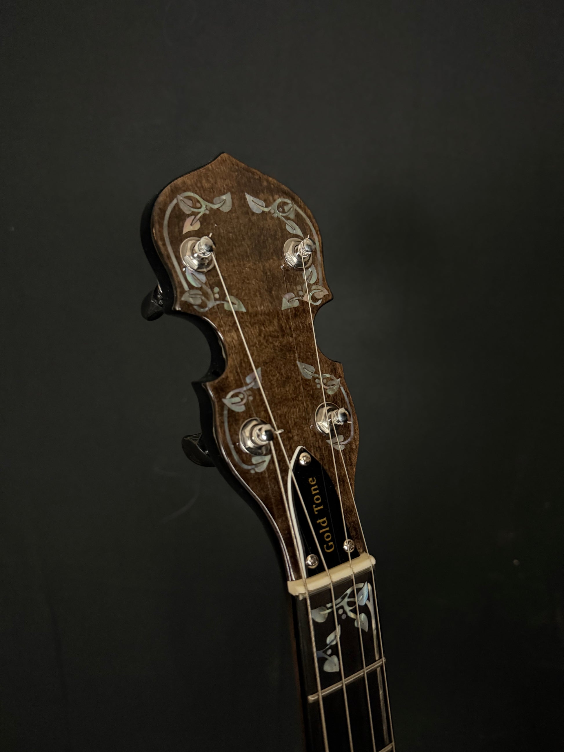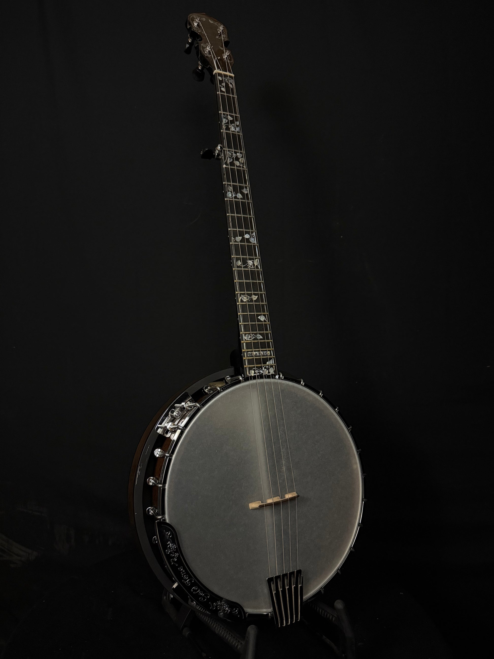 Béla Fleck, surely today's best-known banjoist, has his own heroes. One of these, John Hartford, made extensive use of a low-tuned five-string banjo (a twelve-inch Farland from the 1920s) in his music. While Béla had already been playing a Gold Tone CEB-5 Cello Banjo, he felt that there should be a banjo to fill the gap between the cello banjo (tuned to G, an octave below the standard banjo) and the standard five-string. Béla collaborated with Gold Tone president Wayne Rogers over many months and after overcoming many challenges and the building of several prototypes, the ML-1 "Missing Link" came into being. Tuned to open C (in a G configuration, i.e. an octave below the fifth fret of a standard five-string) the ML-1 features a twelve-inch, three-ply maple rim supporting a bronze tone ring. A specially-made Remo Black Suede head carries a custom 7/8" bridge and an all-wound custom string set hooks up to a Gold Tone Terminator tailpiece. The hard rock Canadian maple neck is topped by a rich black ebony fretboard, honed to a compound radius (5" to 9") and fitted with jumbo frets. The gorgeous art nouveau inlay pattern (of Béla's own design) travels the length of the neck all the way to the peghead, interrupted only by a Zero Glide nut (for super-accurate intonation and low-friction tuning). Black bindings and black buttons on the Master Planetary tuners complete the elegant look.