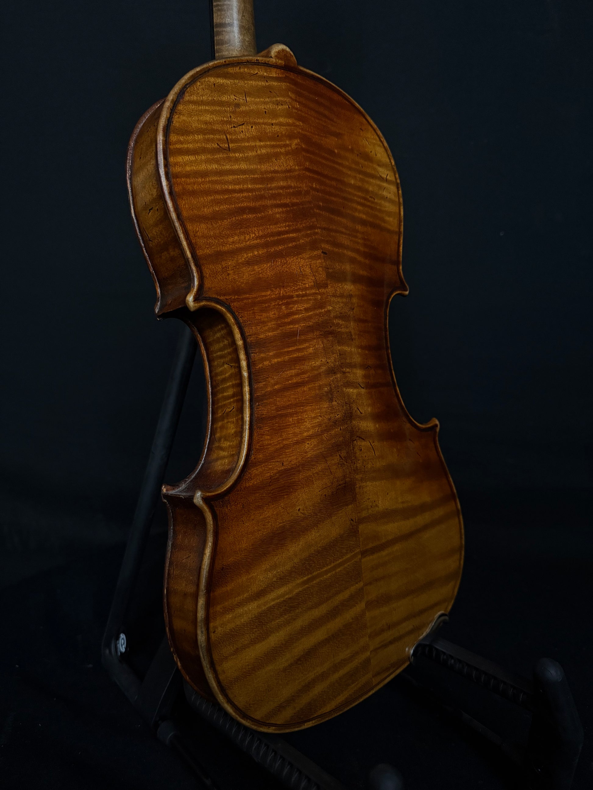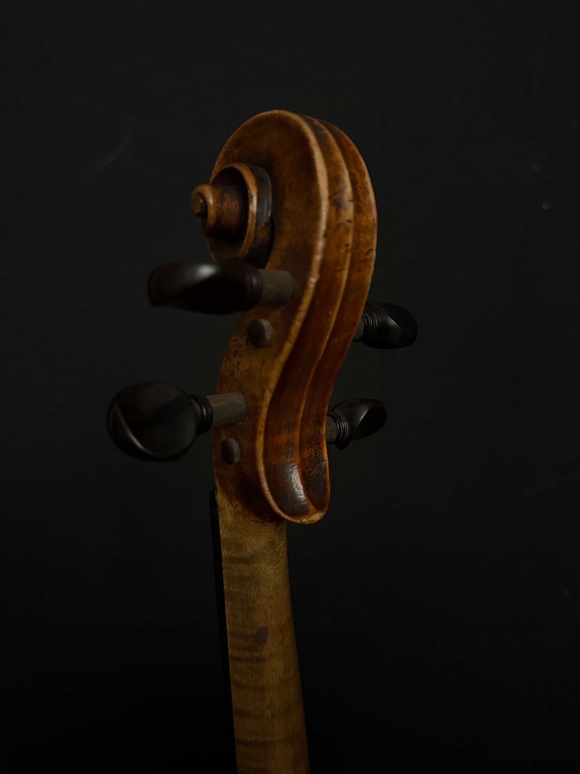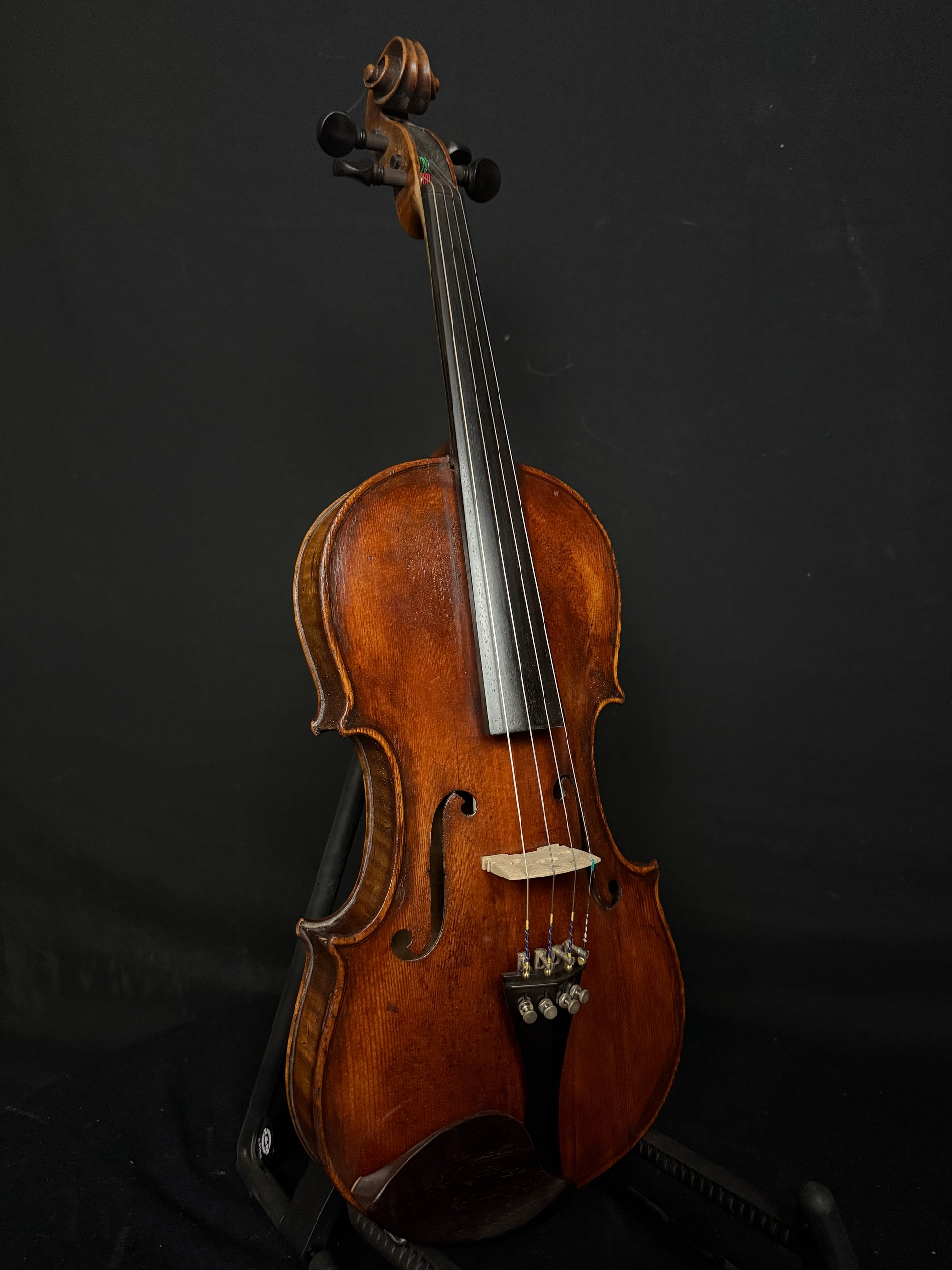 Completely revoiced and setup by long time Asheville luthier Larry Brown, this fine German fiddle is incredibly lightweight and responsive. The top has been re-graduated with a new bass bar, all ebony fittings, and currently setup with D'Addario Helicore with a Kaplan non-whistling E string.