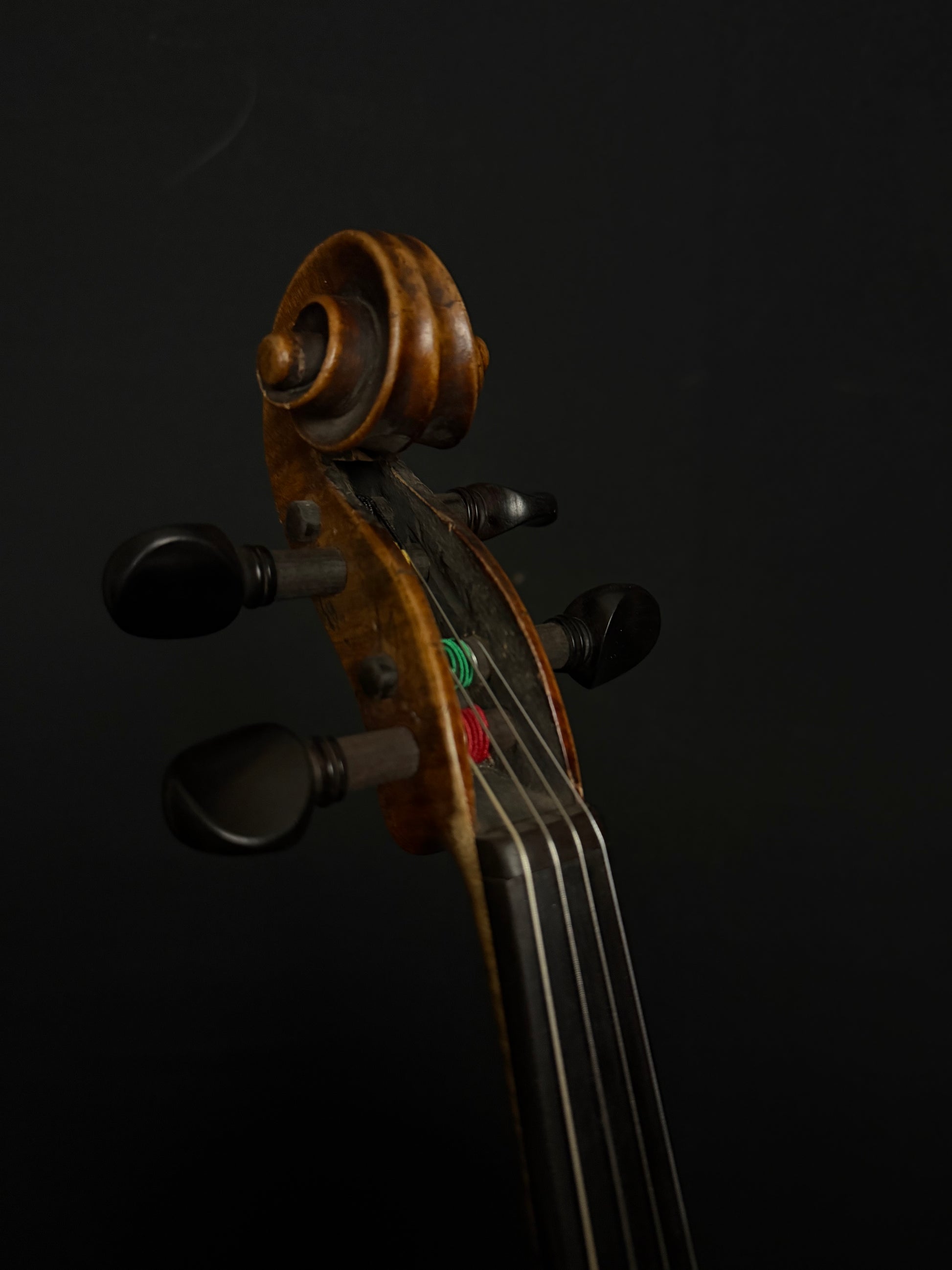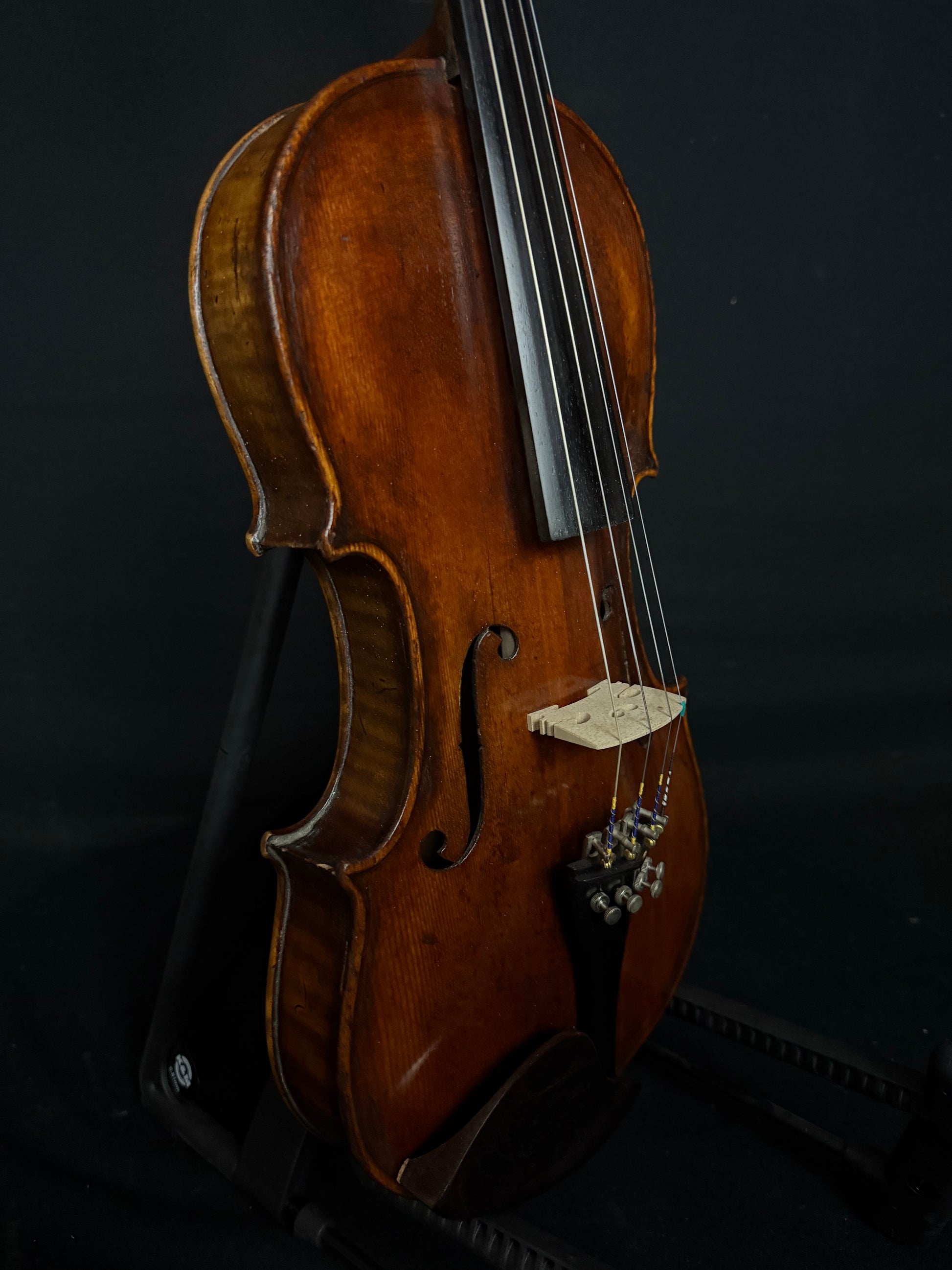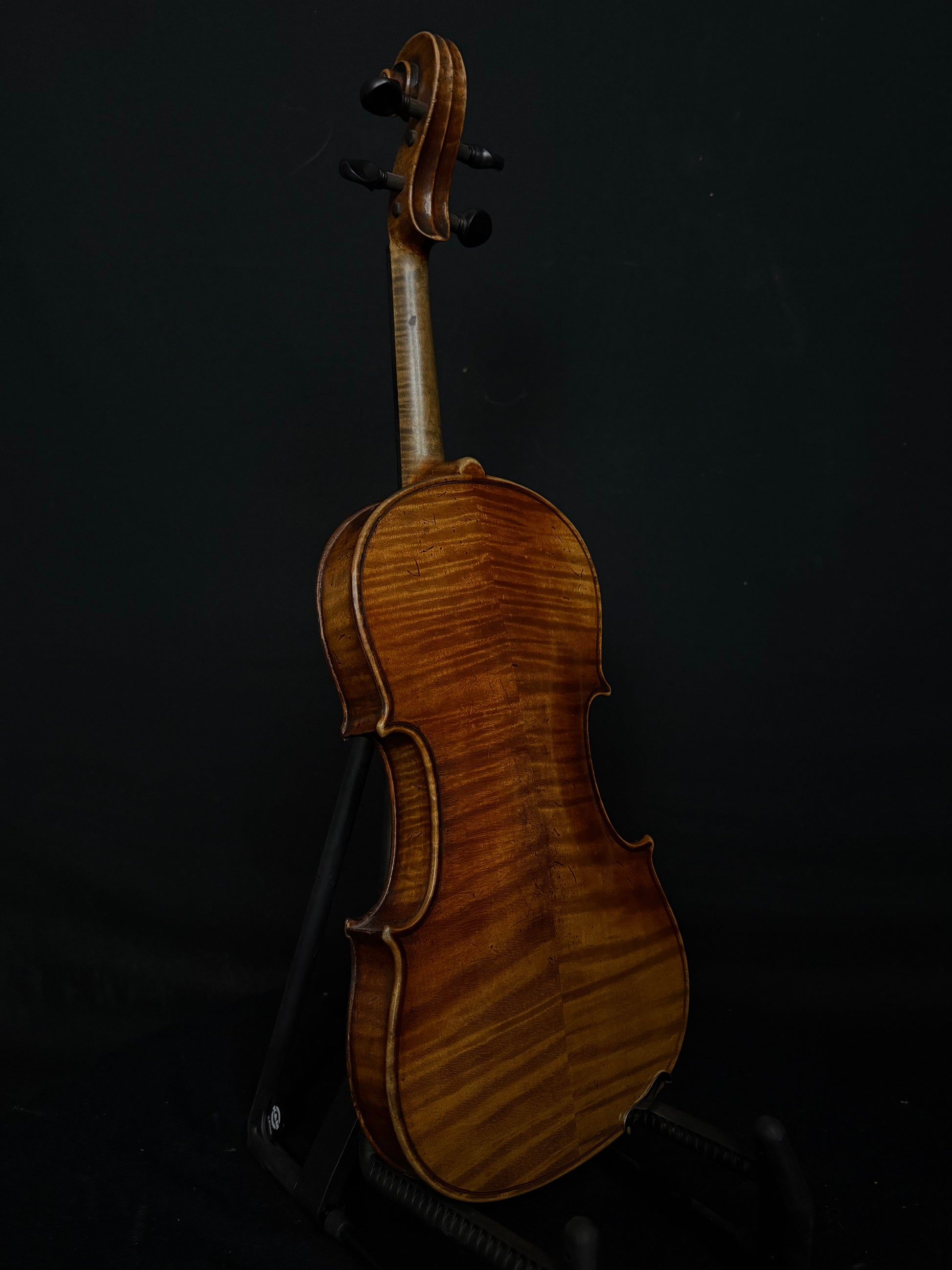 Completely revoiced and setup by long time Asheville luthier Larry Brown, this fine German fiddle is incredibly lightweight and responsive. The top has been re-graduated with a new bass bar, all ebony fittings, and currently setup with D'Addario Helicore with a Kaplan non-whistling E string.
